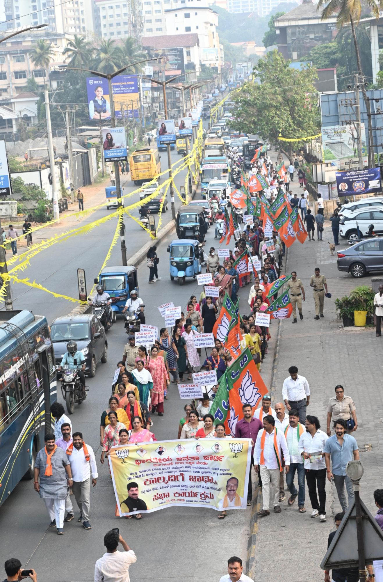 ಮಂಗಳೂರು: ಬಿಜೆಪಿ ಮಂಗಳೂರು ನಗರ ದಕ್ಷಿಣ ಮಂಡಲದ ವತಿಯಿಂದ ಕೇಂದ್ರ ಸರ್ಕಾರದ ಮಹತ್ವಾಕಾಂಕ್ಷಿ ‘ವಿಬಿ ಜಿ ರಾಮ್ ಜಿ’ (VB-G RAM-G) ಕಾಯ್ದೆಯ ಬಗ್ಗೆ ಜನಜಾಗೃತಿ ಮೂಡಿಸಲು ಹಾಗೂ ರಾಜ್ಯ ಸರ್ಕಾರದ ಭ್ರಷ್ಟಾಚಾರದ ವಿರುದ್ಧ ಬಿಜೆಪಿ ಜಿಲ್ಲಾ ಕಚೇರಿಯಿಂದ ಮಂಗಳೂರು ಮಹಾನಗರ ಪಾಲಿಕೆ ಕಚೇರಿಯವರೆಗೆ ಬೃಹತ್ ಕಾಲ್ನಡಿಗೆ ಜಾಥಾ ನಡೆಯಿತು.