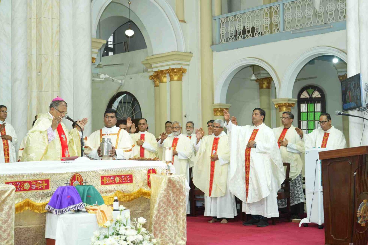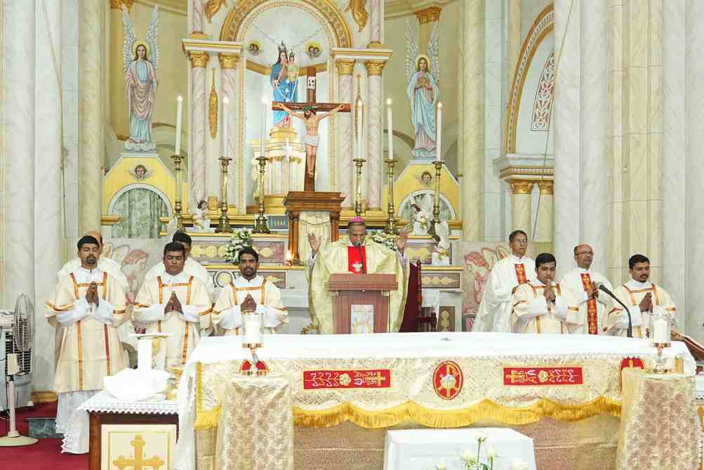 ಮಂಗಳೂರು: ಮುಂಬರುವ ಪವಿತ್ರ ವಾರದ ಆಚರಣೆಗಳಿಗೆ ಮುನ್ನುಡಿಯಾಗಿ ಮಂಗಳೂರು ಧರ್ಮಕ್ಷೇತ್ರದ ವಾರ್ಷಿಕ ‘ಕ್ರಿಸಮ್ ಬಲಿಪೂಜೆ’(ತೈಲ ಪವಿತ್ರಿಕರಿಸುವ ಪೂಜೆ) ಗುರುವಾರ ಸಂಜೆ ನಗರದ ರೊಸಾರಿಯೊ ಕ್ಯಾಥೆಡ್ರೆಲ್ನಲ್ಲಿ ಭಕ್ತಿಪೂರ್ವಕವಾಗಿ ನೆರವೇರಿತು.ಮಂಗಳೂರು ಧರ್ಮಕ್ಷೇತ್ರದ ಧರ್ಮಾಧ್ಯಕ್ಷ ಪರಮ ಪೂಜ್ಯ ಡಾ. ಪೀಟರ್ ಪಾವ್ಲ್ ಸಲ್ಡಾನ್ಹಾ ಅವರು ಈ ಪವಿತ್ರ ಬಲಿಪೂಜೆಯ ನೇತೃತ್ವ ವಹಿಸಿದ್ದರು.