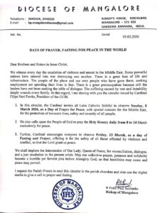 ಇದೇ ವೇಳೆ, ಮಾರ್ಚ್ 8ರಿಂದ 14ರವರೆಗೆ ಪ್ರತಿದಿನವೂ ಶಾಂತಿಗಾಗಿ ವಿಶೇಷವಾಗಿ ಪವಿತ್ರ ಜಪಸರ ಪ್ರಾರ್ಥನೆ ಮಾಡುವಂತೆ ಮನವಿ ಮಾಡಲಾಗಿದೆ. ಮಾರ್ಚ್ 13ರಂದು ಶುಕ್ರವಾರ ಉಪವಾಸ ಮತ್ತು ಪ್ರಾರ್ಥನಾ ದಿನವಾಗಿ ಆಚರಿಸಿ, ವಿಶ್ವಶಾಂತಿ ಹಾಗೂ ಹಿಂಸಾಚಾರದಿಂದ ಬಳಲುತ್ತಿರುವ ಎಲ್ಲರ ಸುರಕ್ಷತೆಗೆ ತ್ಯಾಗ ಸಮರ್ಪಿಸಲು ಕೋರಲಾಗಿದ್ದು ಸಾಮೂಹಿಕ ಪ್ರಾರ್ಥನೆ, ತಪಸ್ಸು ಮತ್ತು ಏಕತೆ ಮೂಲಕ ಸರ್ವಶಕ್ತ ದೇವರ ಮುಂದೆ ವಿನಮ್ರವಾದ ಮನವಿ ಸಲ್ಲಿಸಿ, ದ್ವೇಷದ ಮನೋಭಾವಗಳು ದೂರವಾಗಿ, ಹಿಂಸಾಚಾರ ನಿಂತು, ವಿಶ್ವದಲ್ಲಿ ಶಾಂತಿ ನೆಲೆಸಲೆಂದು ಆಶಿಸಲಾಗಿದೆ ಎಂದು ಬಿಷಪರು ತಮ್ಮ ಮಾಧ್ಯಮ ಪ್ರಕಟಣೆಯಲ್ಲಿ ತಿಳಿಸಿದ್ದಾರೆ.