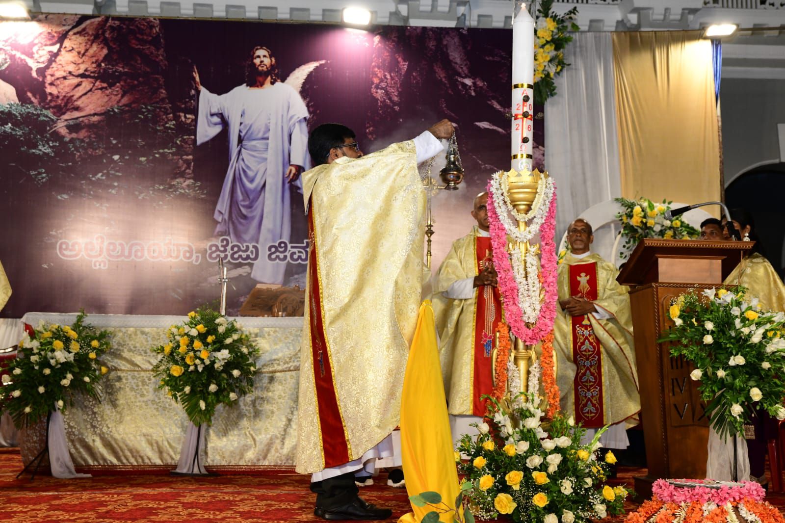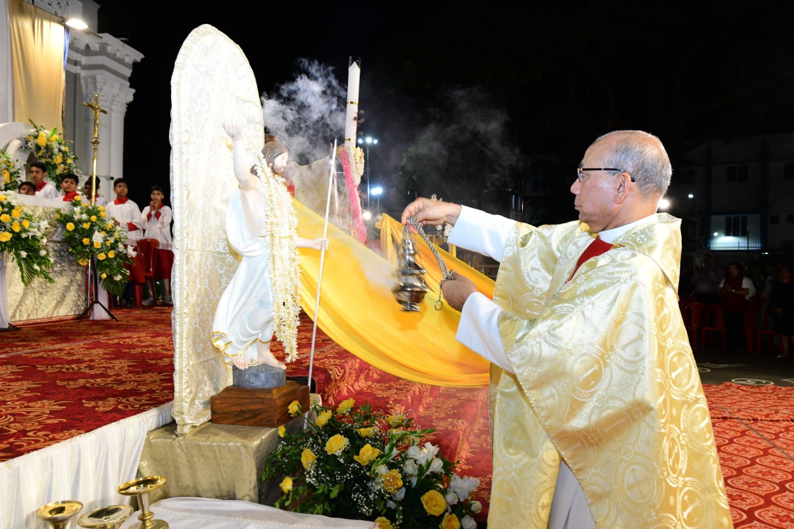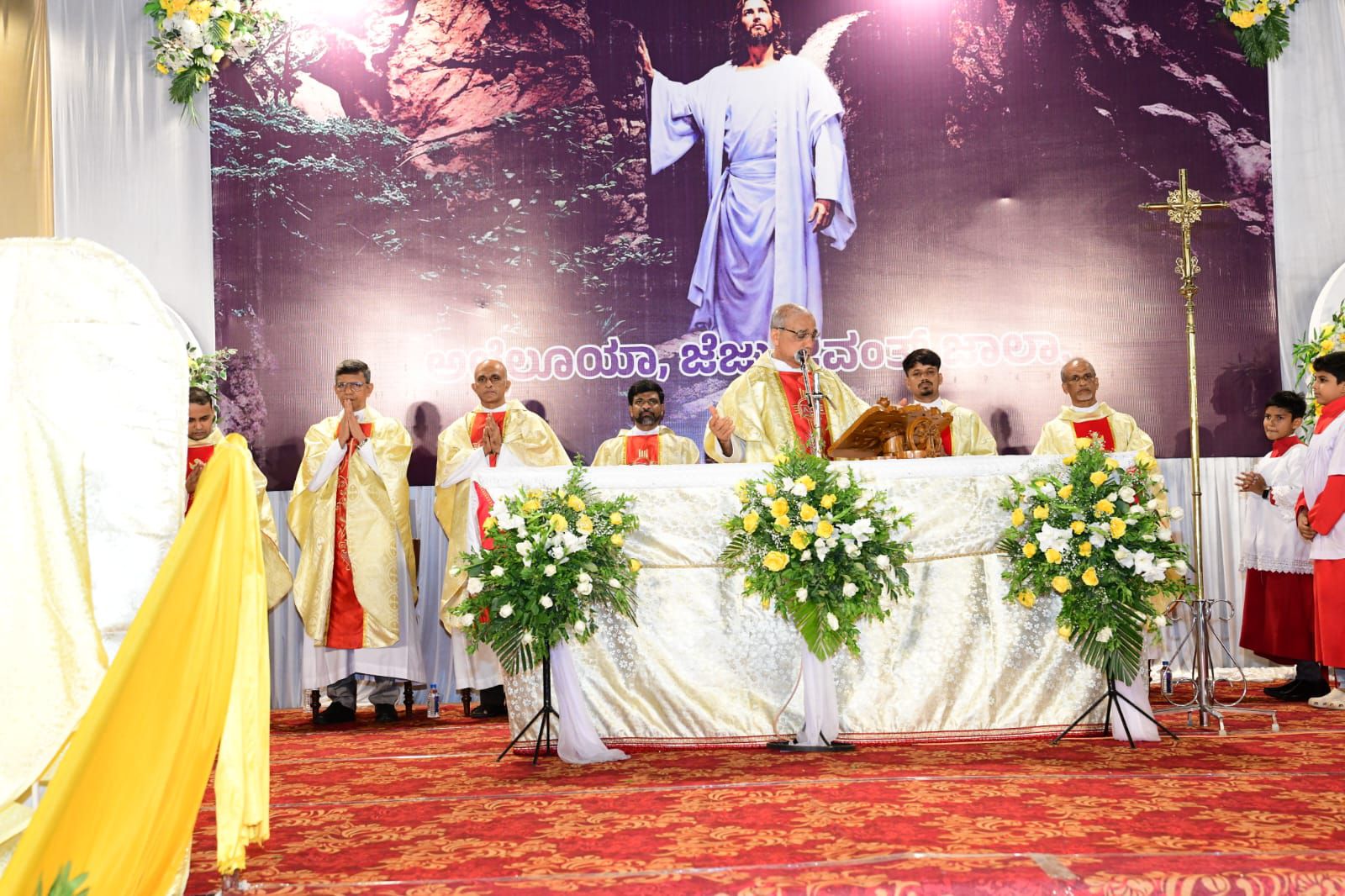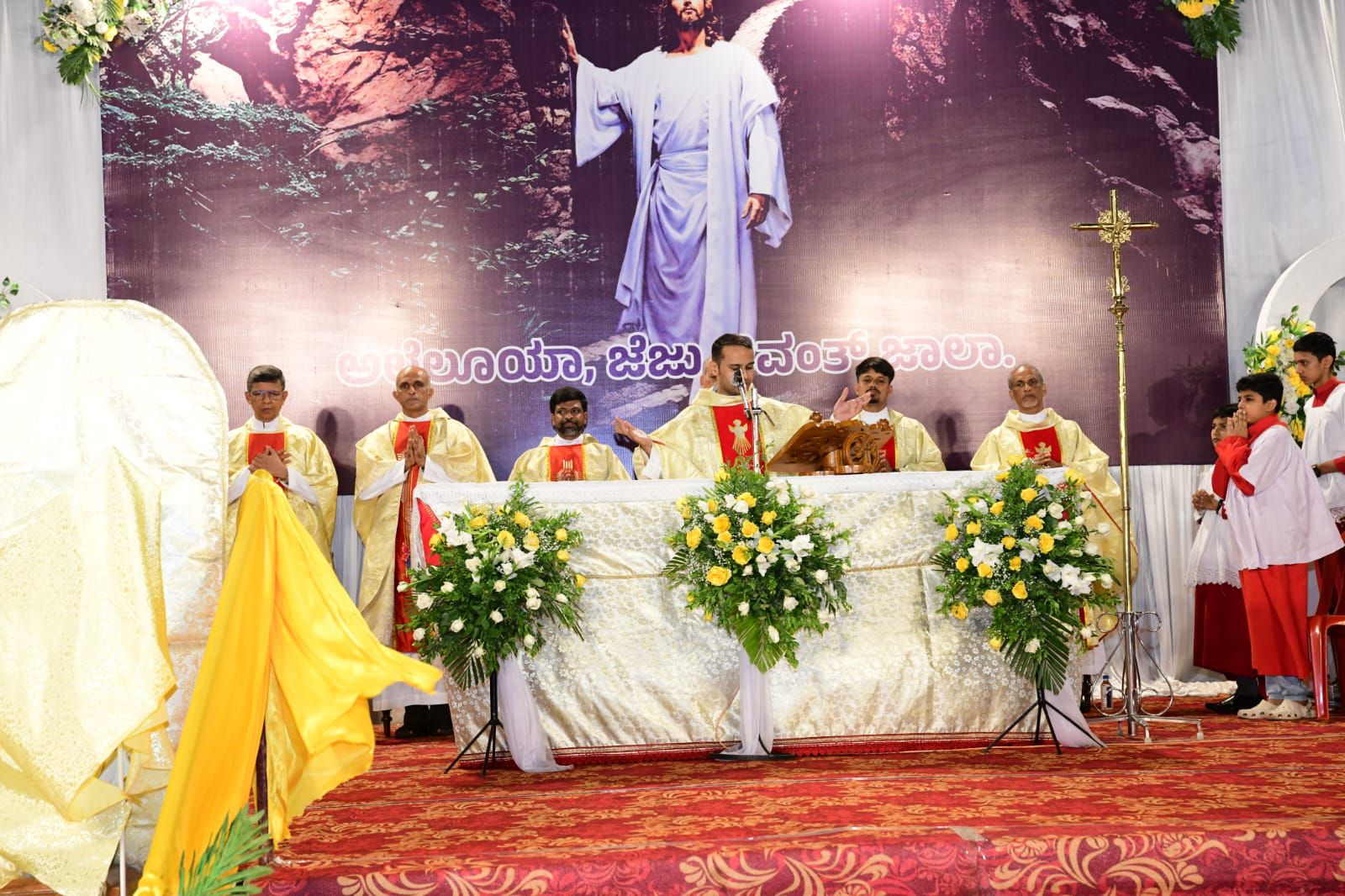 ಪವಿತ್ರ ಬಲಿಪೂಜೆಯನ್ನು ವಂದನೀಯ ಪೂಜ್ಯ ಬೊನಾವೆಂಚರ್ ನಜರೆತ್ ಅವರು ನೆರವೇರಿಸಿದರು. ವಂದನೀಯ ಪೂಜ್ಯ ಮ್ಯಾಕ್ಸಿಮ್ ರೊಸಾರಿಯೊ ಅವರು ಈ ಸಂದರ್ಭದಲ್ಲಿ ಪ್ರಬೋಧನೆ ನೀಡಿ, ಈಸ್ಟರ್ ಹಬ್ಬದ ಮಹತ್ವವನ್ನು ವಿವರಿಸಿದರು. ವಂದನೀಯ ಪೂಜ್ಯ ಉದಯ್ ಫೆರ್ನಾಂಡಿಸ್ ಅವರು ಸಾಂಪ್ರದಾಯಿಕ ಪಾಸ್ಕಾ ಸ್ತೋತ್ರವನ್ನು ಹಾಡಿದರು.