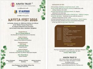 ಮಂಗಳೂರು: ಕೊಂಕಣಿ ಕಾವ್ಯದ ಸ್ಥಾನಮಾನವನ್ನು ಗಣನೀಯವಾಗಿ ಹೆಚ್ಚಿಸಿರುವ ಕವಿತಾ ಟ್ರಸ್ಟ್, ಈ ವರ್ಷ ತನ್ನ ಇಪ್ಪತ್ತನೇ ಕವಿತಾ ಫೆಸ್ತ್ ಹಬ್ಬವನ್ನು ಆಚರಿಸುತ್ತಿದೆ. ಈ ಉತ್ಸವವು ಜ. 11 ರಂದು ಬೆಳಿಗ್ಗೆ 9:30 ರಿಂದ ಸಂಜೆ 4:30 ರವರೆಗೆ ಸಂತ ಅಲೋಶಿಯಸ್ (ಪರಿಗಣಿತ ವಿಶ್ವವಿದ್ಯಾಲಯ)ನಲ್ಲಿರುವ ಮದರ್ ತೆರೇಸಾ ಪೀಸ್ ಪಾರ್ಕ್ನಲ್ಲಿ ನಡೆಯಲಿದೆ. ಕೊಂಕಣಿ ಭಾಷೆಯ ಬಗ್ಗೆ ಉತ್ಸಾಹ ಹೊಂದಿರುವ ಯಾರಾದರೂ ಈ ಉತ್ಸವದಲ್ಲಿ ಭಾಗವಹಿಸಬಹುದು.