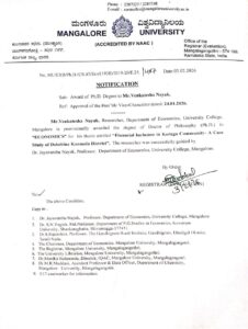 ಮಂಗಳೂರು: ಮಂಗಳೂರು ವಿಶ್ವವಿದ್ಯಾನಿಲಯವು ಅರ್ಥಶಾಸ್ತ್ರ ವಿಭಾಗದಲ್ಲಿ ನಡೆಸಿದ ಸಂಶೋಧನೆಗಾಗಿ ವೆಂಕಟೇಶ ನಾಯಕ್ ಅವರಿಗೆ ಡಾಕ್ಟರ್ ಆಫ್ ಫಿಲಾಸಫಿ (ಪಿಎಚ್.ಡಿ.) ಪದವಿಯನ್ನು ಪ್ರದಾನ ಮಾಡಿದೆ.