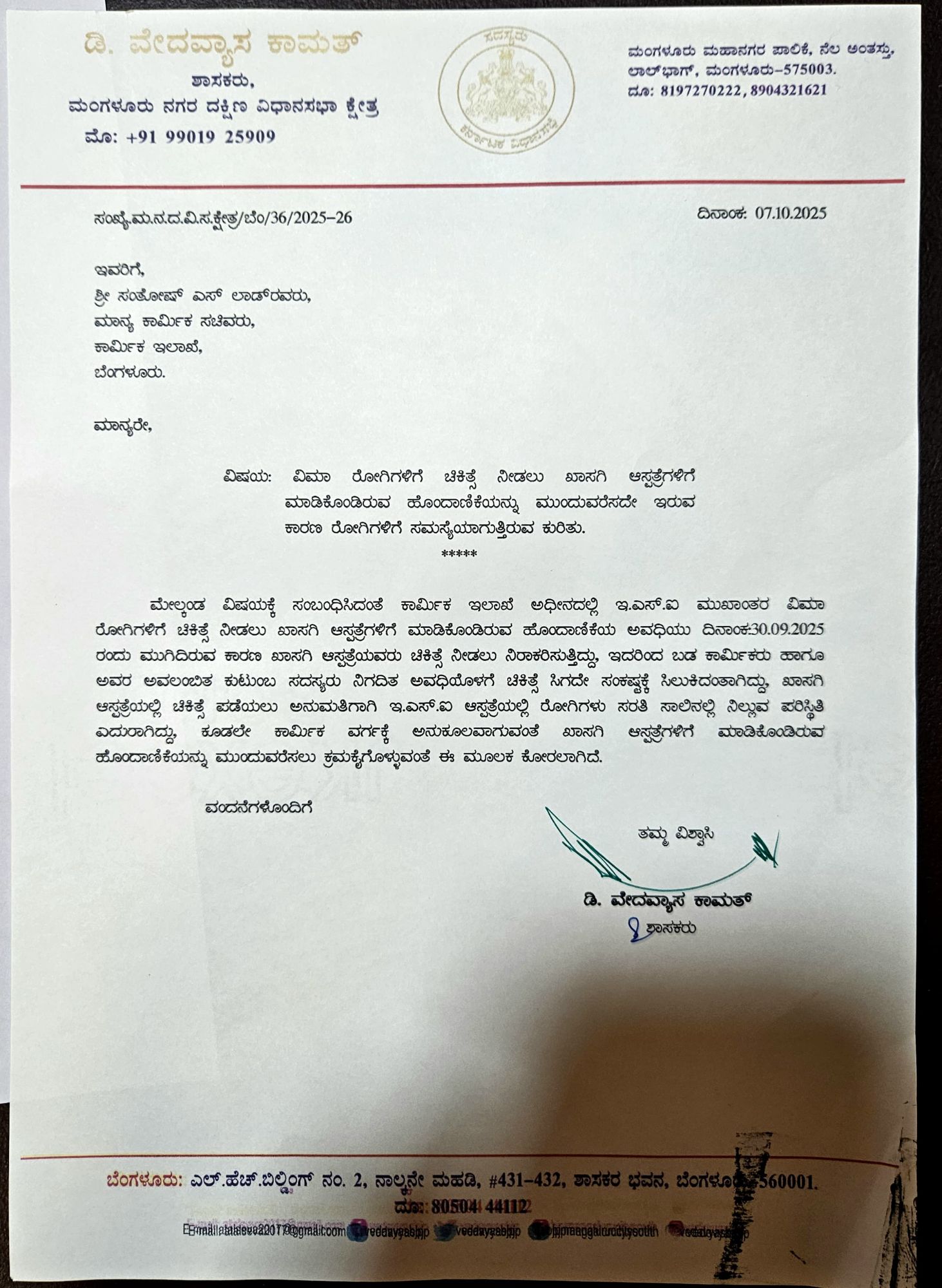 ಮಂಗಳೂರು ಅ 07: ಕಾರ್ಮಿಕರ ಆರೋಗ್ಯ ವಿಮೆ (ಇಎಸ್ಐ) ಅಡಿಯಲ್ಲಿ ಚಿಕಿತ್ಸೆ ಪಡೆಯುವ ವಿಮೆದಾರರು ಹಾಗೂ ಅವರ ಕುಟುಂಬ ಸದಸ್ಯರಿಗೆ ರಾಜ್ಯ ಕಾಂಗ್ರೆಸ್ ಸರ್ಕಾರದ ನಿರ್ಲಕ್ಷ್ಯದಿಂದಾಗಿ ವೈದ್ಯಕೀಯ ಸೌಲಭ್ಯ ಪಡೆಯುವಲ್ಲಿ ತೀವ್ರ ತೊಂದರೆಯಾಗುತ್ತಿದ್ದು ಇನ್ನೂ ಸಹ ಸರ್ಕಾರ ಎಚ್ಚೆತ್ತುಕೊಳ್ಳದಿರುವುದು ಖಂಡನೀಯವೆಂದು ಶಾಸಕ ವೇದವ್ಯಾಸ ಕಾಮತ್ ರವರು ಆಕ್ರೋಶ ವ್ಯಕ್ತಪಡಿಸಿದರು.