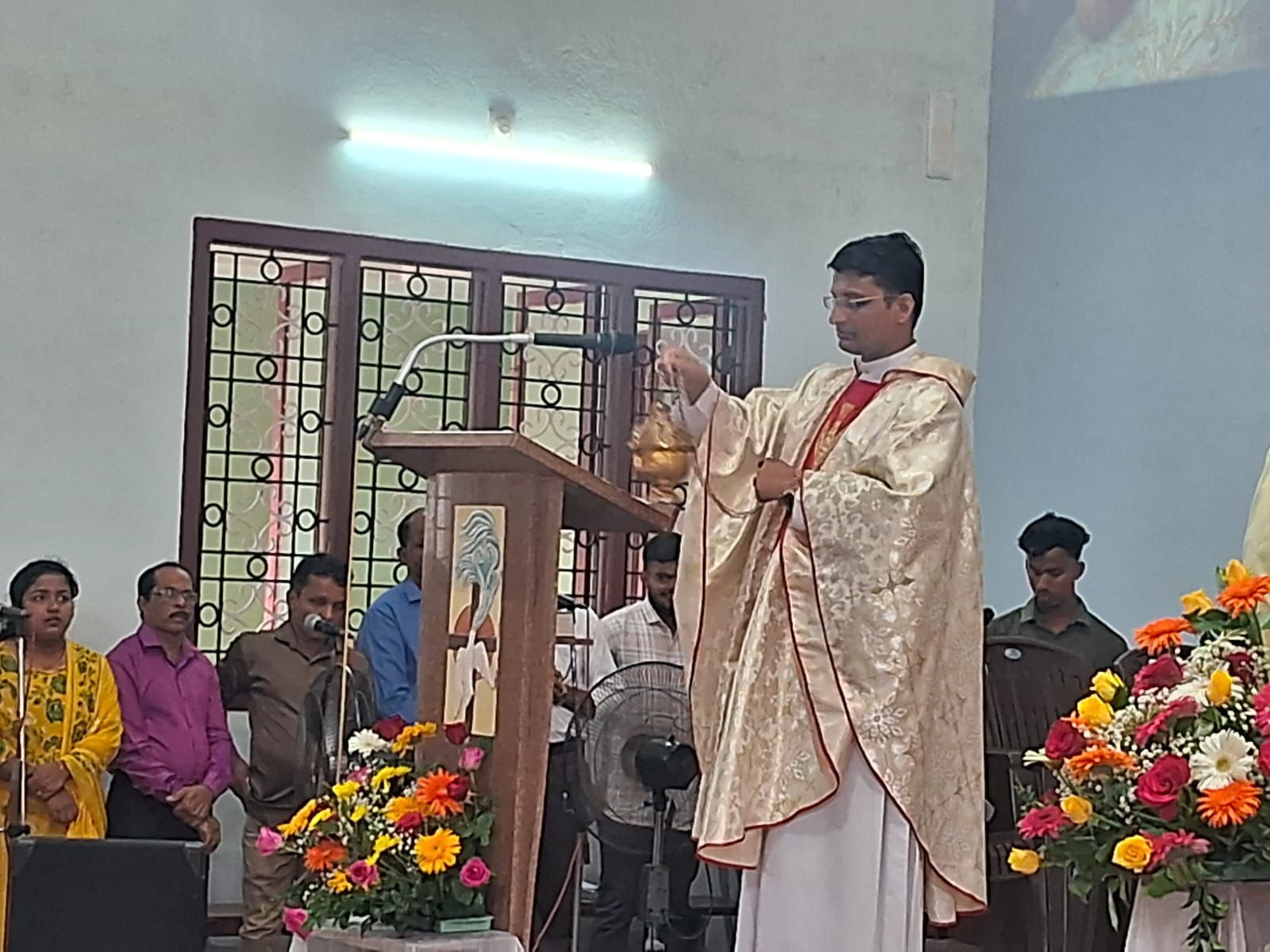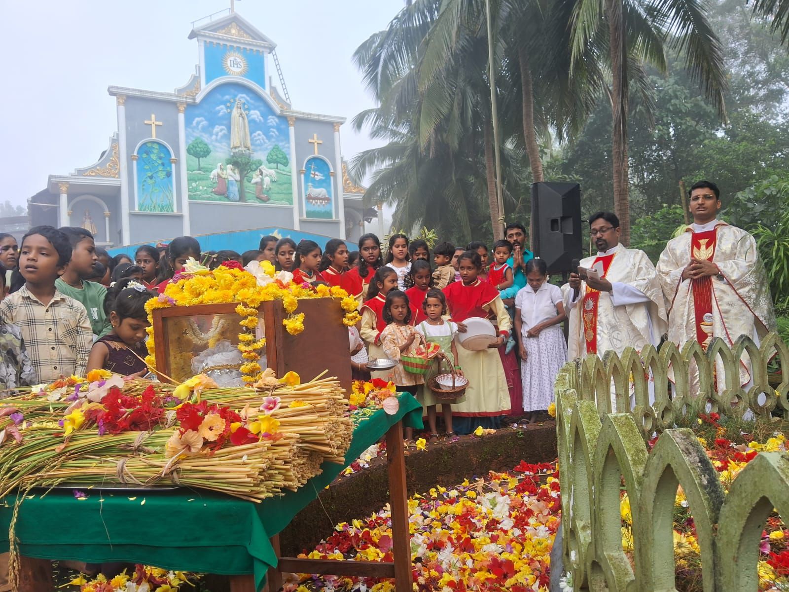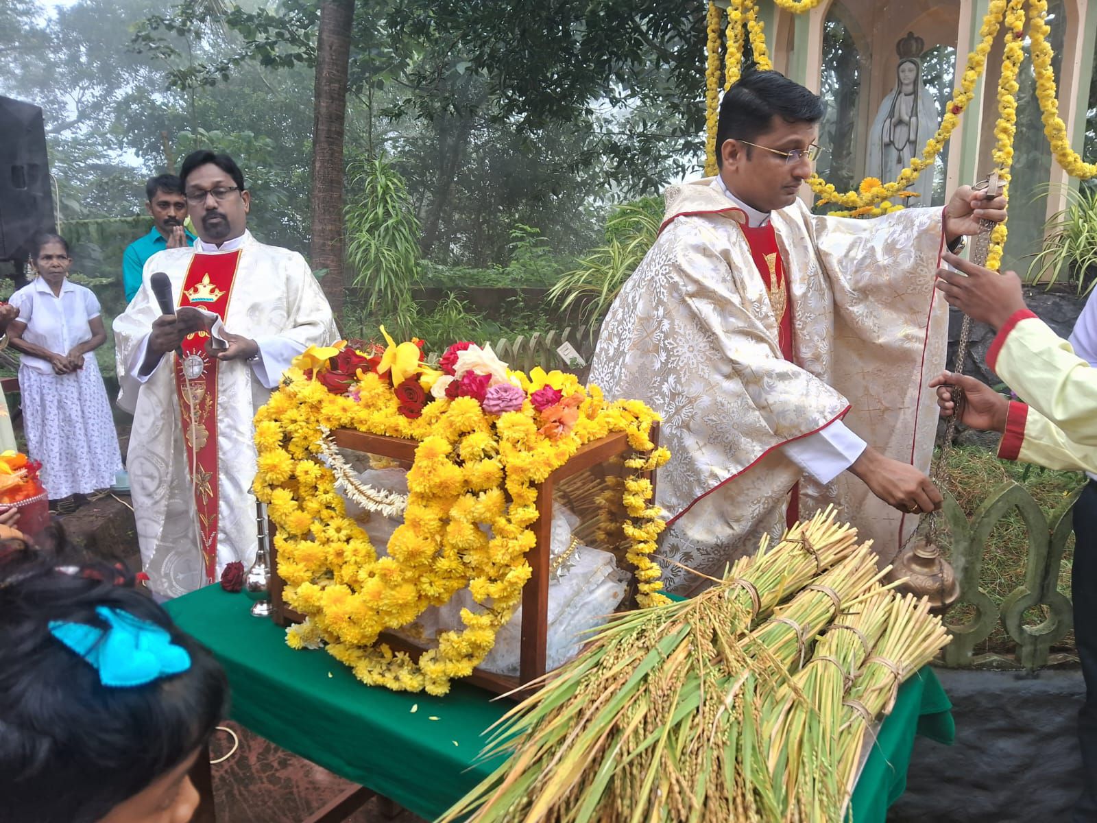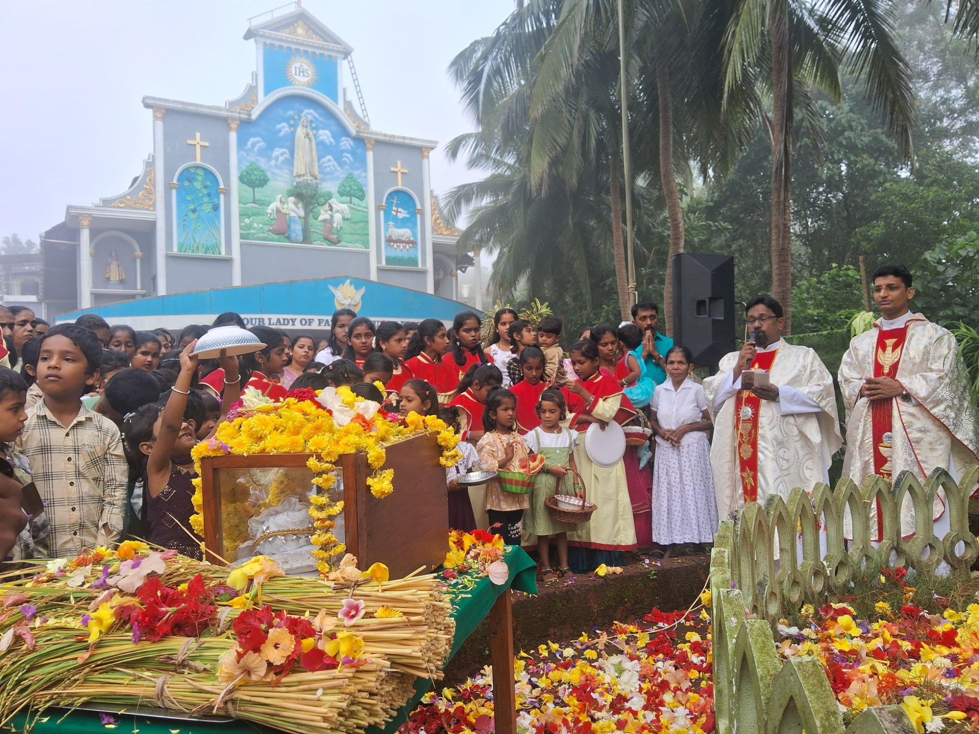 ವಿಟ್ಲ: ಪೆರುವಾಯಿಯ ಫಾತಿಮಾ ಮಾತೆಯ ದೇವಾಲಯದಲ್ಲಿ ಮೋಂತಿ ಹ\nಬ್ಬದ ಪ್ರಯುಕ್ತ ವಿಶೇಷ ಬಲಿಪೂಜೆ ನಡೆಯಿತು.ಕೆನರಾ ಕಮ್ಯೂನಿಕೇಷನ್ ನ ನಿರ್ದೇಶಕ ಅನಿಲ್ ಐವನ್ ಫೆರ್ನಾಂಡೀಸ್ ಅವರು ವಿಶೇಷ ಬಲಿಪೂಜೆ ನಡೆಸಿಹಬ್ಬದ ವಿಶೇಷತೆಗಳು ಹಾಗೂ ಕೌಟುಂಬಿಕ ಸಂಬಂಧಗಳ ಮೌಲ್ಯಗಳ ಬಗ್ಗೆ ವಿಶೇಷ ಪ್ರವಚನವಿತ್ತರು. ಬಲಿಪೂಜೆಯ ಮೊದಲು ಮೇರಿ ಮಾತೆಗೆ ಮಕ್ಕಳು ಹೂವನ್ನು ಅರ್ಪಿಸಿದರು. ಇದೇ ವೇಳೆ ಹೊಸ ತೆನೆಯನ್ನು ಆರ್ಶಿವದಿಸಿದರು.