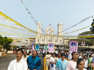 ಬಲಿಪೂಜೆಯ ನಂತರ, ಪವಿತ್ರ ಪ್ರಸಾದವನ್ನು ಹೊತ್ತ ಅಲಂಕೃತ ವಾಹನವು ನಗರದ ಪ್ರಮುಖ ರಸ್ತೆಗಳಲ್ಲಿ ಸಾಗಿತು. ಹಂಪನಕಟ್ಟೆ, ಕ್ಲಾಕ್ ಟವರ್ ವೃತ್ತ, ಎ.ಬಿ. ಶೆಟ್ಟಿ ವೃತ್ತ ಮತ್ತು ನೆಹರು ವೃತ್ತದ ಮೂಲಕ ಸಾಗಿದ ಮೆರವಣಿಗೆಯಲ್ಲಿ ಸಾವಿರಾರು ಭಕ್ತಾದಿಗಳು ಪಾಲ್ಗೊಂಡರು. ಬ್ಯಾಂಡ್-ಸಂಗೀತ ಮತ್ತು ಗಾಯನ ತಂಡಗಳೊಂದಿಗೆ ಭಕ್ತಿಗೀತೆಗಳನ್ನು ಹಾಡುತ್ತಾ ಭಕ್ತರು ಸಾಗಿದರು.