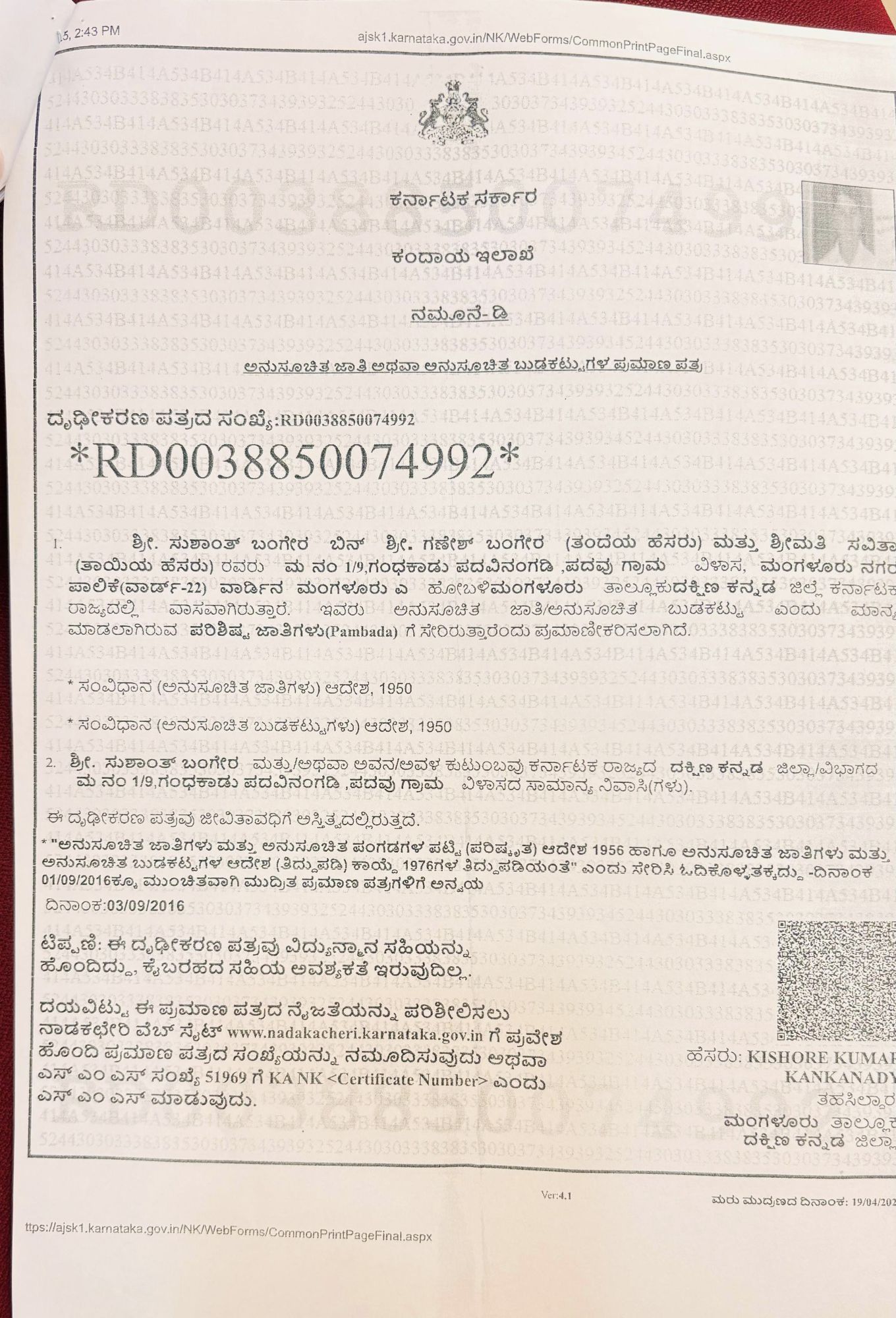 ”ನಮ್ಮದೇ ಪಂಬದ ಸಮುದಾಯದ ಗಣೇಶ್ ಪದವಿನಂಗಡಿ ಎಂಬವರು ಮದುವೆ ಆಗಿರುವುದು ಕ್ರಿಶ್ಚನ್ ಮಹಿಳೆಯನ್ನು ಎಂಬುದು ಸತ್ಯ. ಮಾತ್ರವಲ್ಲದೆ ಯಾವಾಗ ಕ್ರಿಶ್ಚಿಯನ್ ಮಹಿಳೆ ಗಣೇಶ್ ಎಂಬವರನ್ನು ಮದುವೆಯಾದರೂ ಆವಾಗಲೇ ನಮ್ಮ ಹಿಂದೂ ಸಂಪ್ರದಾಯಕ್ಕೆ ಹಾಗೂ ಪಂಬದ ಜಾತಿಯ ನೀತಿ ನಿಯಮಗಳನ್ನು ಪಾಲಿಸಿಕೊಂಡು ಬಂದಿರುತ್ತಾರೆ ಯಾವಾಗ ಒಂದು ಹೆಣ್ಣು ತನ್ನ ಮೂಲ ಧರ್ಮವನ್ನೇ ಬಿಟ್ಟು ಮತ್ತೊಂದು ಧರ್ಮಕ್ಕೆ ಬಂದು ಇಲ್ಲಿನ ಆಚಾರ ವಿಚಾರ ಪದ್ದತಿಗಳನ್ನು ಅನುಸರಿಸುತ್ತಾರೆ ಅವರು ನಮ್ಮವರಾಗುತ್ತಾರೆ ಮಾತ್ರವಲ್ಲದೆ ಹೆಣ್ಣನ್ನು ಈ ವಿಚಾರದಲ್ಲಿ ದೂಷಣೆ ಮಾಡುವುದು ಅತಿ ದೊಡ್ಡ ಅನ್ಯಾಯವಾಗುತ್ತದೆ. ಹಾಗೆಯೇ ಪಂಬದ ಜನಾಂಗದ ಗಣೇಶ ಅವರು ಹಿಂದು ಸಂಪ್ರದಾಯದಂತೆ ಮದುವೆಯಾಗಿ ಅದರ ನಂತರ ಸುಶಾಂತ್ ಪಂಬದರನ್ನು ಮಗುವಾಗಿ ಪಡೆಯುತ್ತಾರೆ. ಅದರಂತೆ ಕಾನೂನು ಪ್ರಕಾರ ಜಾತಿ ಪ್ರಮಾಣ ಪತ್ರ ಹಾಗೂ ಎಲ್ಲಾ ದಾಖಲೆಗಳನ್ನು ಈಗಾಗಲೇ ಮಾಡಿಕೊಂಡಿರುತ್ತಾರೆ“ ಎಂದು ಇದೇ ಸಂದರ್ಭದಲ್ಲಿ ಹೇಳಿದರು.