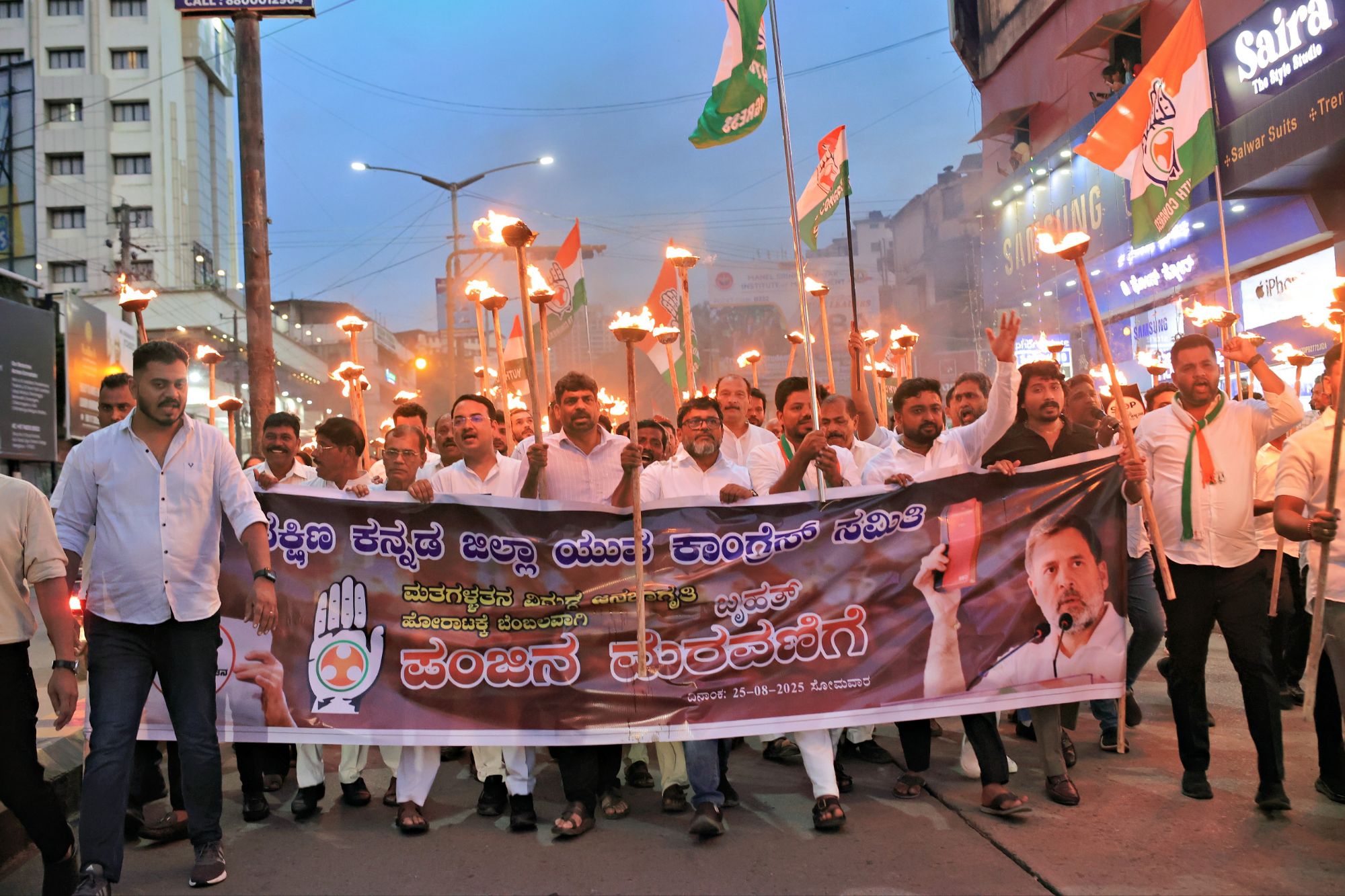 ಮಂಗಳೂರಿನ ನವಭಾರತ್ ಸರ್ಕಲ್ ನಿಂದ ಲಾಲ್ಭಾಗ್ ವರೆಗೆ ನಡೆದ ಪಂಜಿನ ಮೆರವಣಿಗೆಯಲ್ಲಿ ಕಾಂಗ್ರೆಸ್ ಪಕ್ಷದ ಹಾಗೂ ಯುವ ಕಾಂಗ್ರೆಸ್ ಕಾರ್ಯಕರ್ತರು ಭಾಗವಹಿಸಿ ಮತಗಳ್ಳತನ ವಿರುದ್ಧ ಆಕ್ರೋಶ ವ್ಯಕ್ತಪಡಿಸಿದರು.